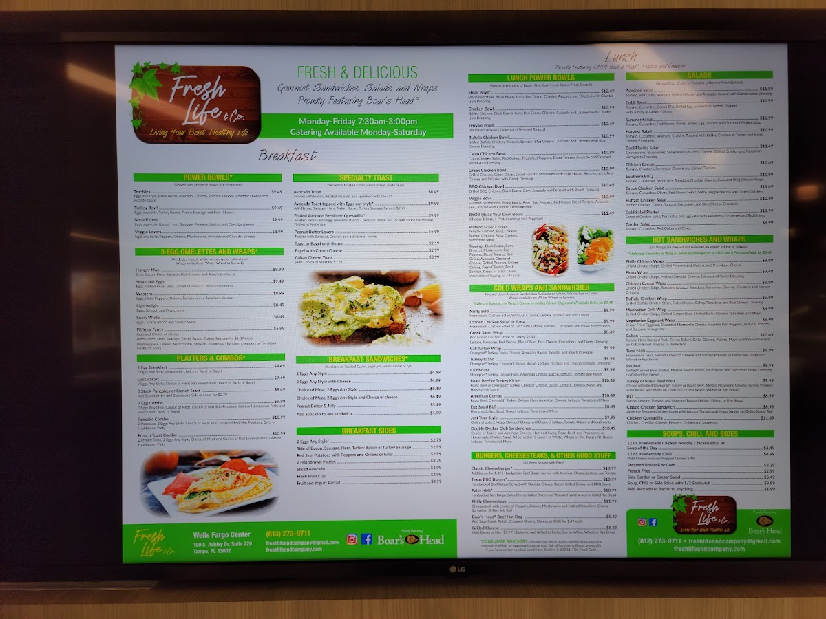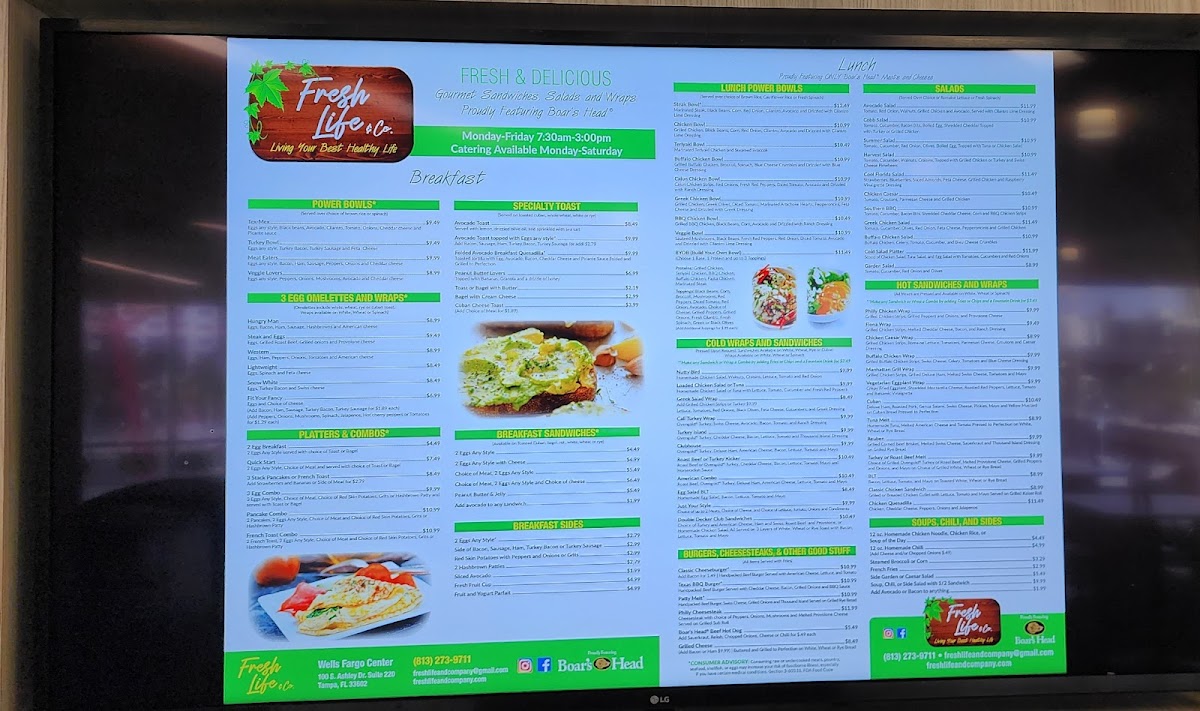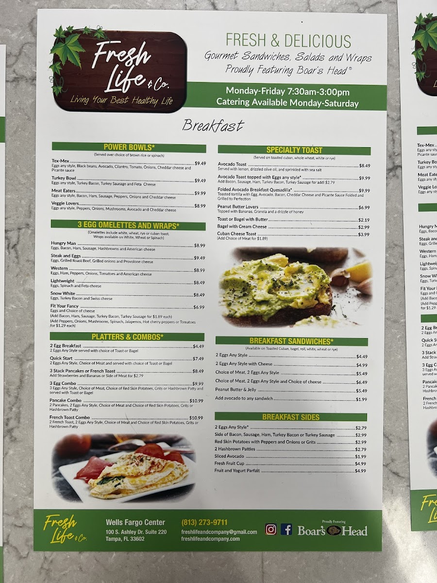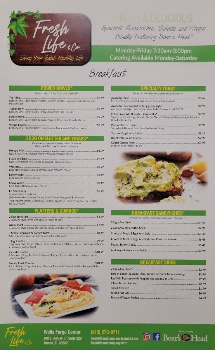 Additional menu items include breakfast options such as the Pancake Combo and side dishes like bacon, as well as lighter salads and wraps including the Cool Florida Salad and Fiona Wrap served with chips. The menu supports both casual dining and quick orders, accommodating guests seeking a variety of deli-style meals and breakfast choices.