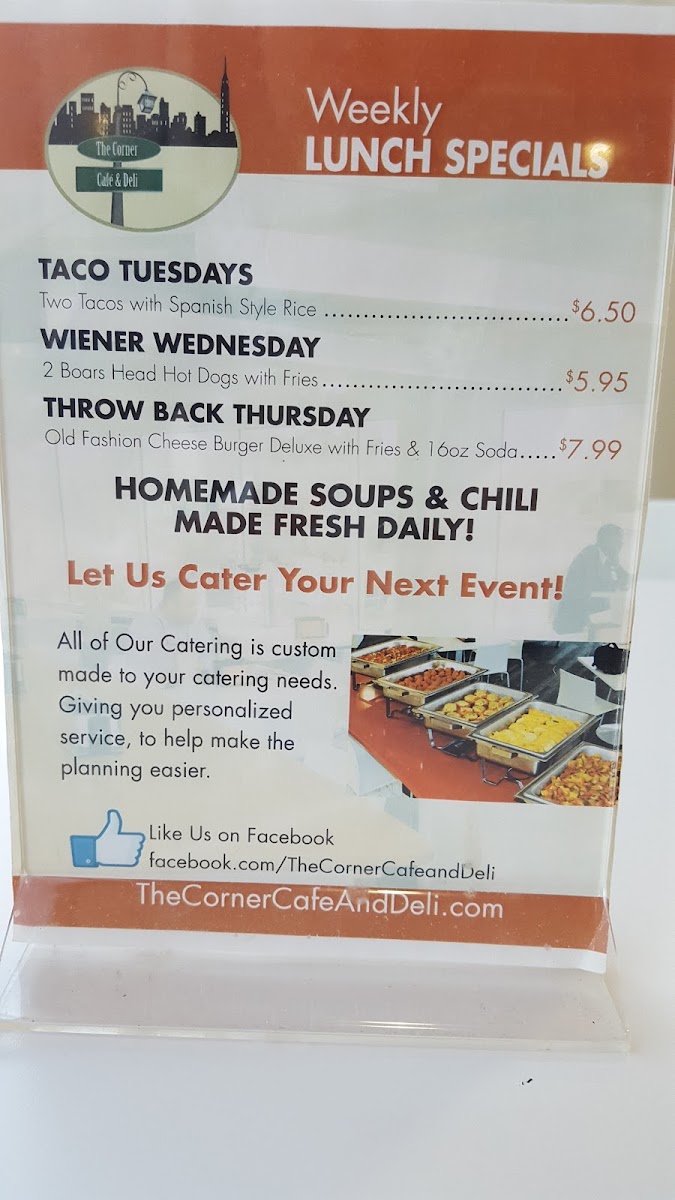 The menu at The Corner Cafe & Deli features a variety of options suitable for breakfast, lunch, and light meals throughout the day. It includes freshly prepared soups such as Chicken Noodle and Chicken Rice, both available in 12 oz. servings. Specialty sandwiches highlight selections like The Kicker, featuring roast beef with horseradish cheddar and bacon, and the Italian Combo Sandwich, which combines ham, salami, pepperoni, and provolone cheese. Customers can customize options by adding peppers or choosing to have sandwiches pressed.